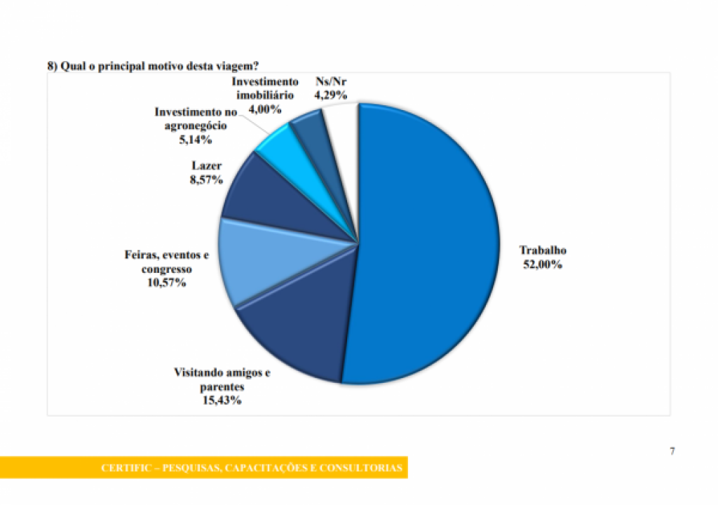 A pesquisa ainda revelou o perfil dos turistas que visitam Sorriso, suas preferências de consumo e o gasto médio diário durante a estadia. O levantamento mostra que a maioria dos visitantes vem do próprio estado de Mato Grosso e que 52% das viagens têm como principal motivação o trabalho, reforçando a força do turismo de negócios no município.