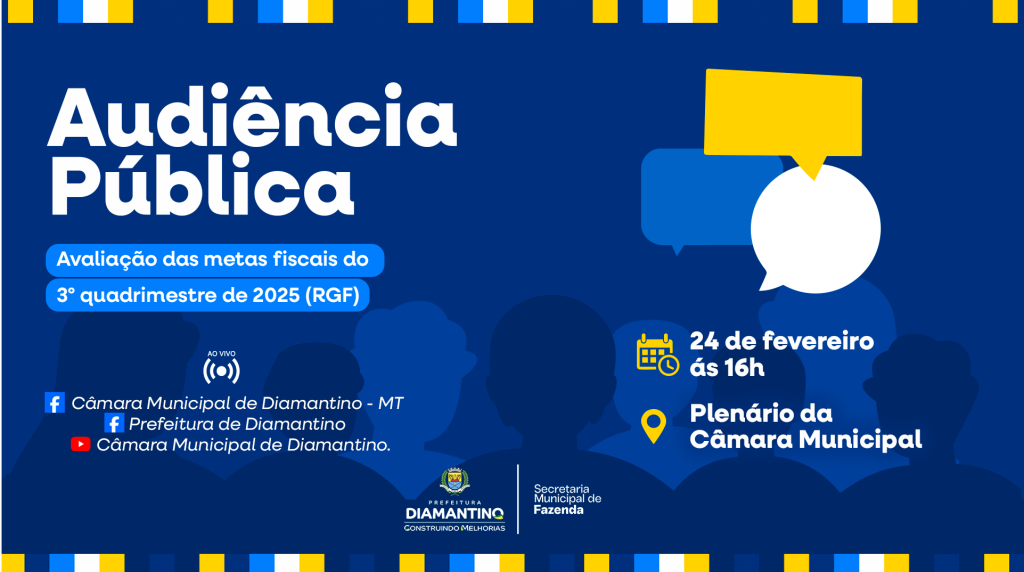 A Prefeitura de Diamantino por meio da Secretaria Municipal de Fazenda convida toda a população para participar da audiência pública de avaliação do cumprimento das