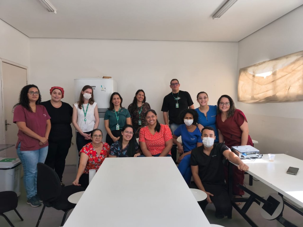 A imagem mostra um grupo de servidores que fazem parte do CEREST, tema abordado no texto. Na imagem, há uma mesa grande à frente do grupo, que está todo posicionado em pé para o retrato.