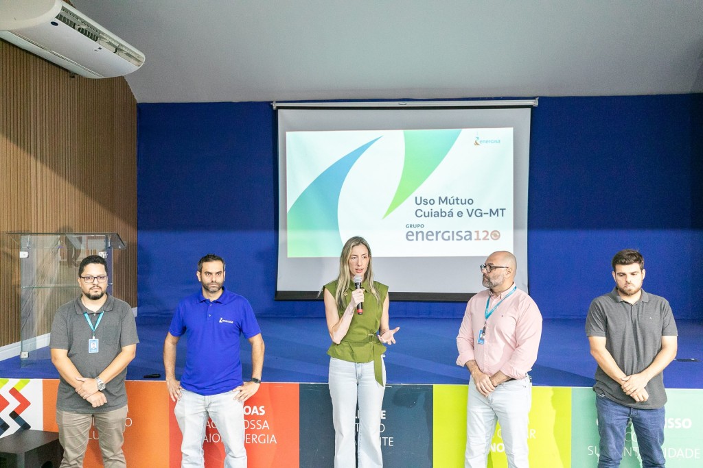 A imagem mostra a secretária de Ordem Pública de Cuiabá, Juliana Palhares, vestindo calça jeans clara e blusa verde militar. Ela discursa no auditório da Energisa, localizado no Morro da Luz, em Cuiabá. Ao seu lado, estão um representante da Prefeitura de Várzea Grande e membros da equipe da Concessionária Energisa, responsável por fiscalizar e cobrar as operadoras quanto a eventuais irregularidades nos postes da capital.