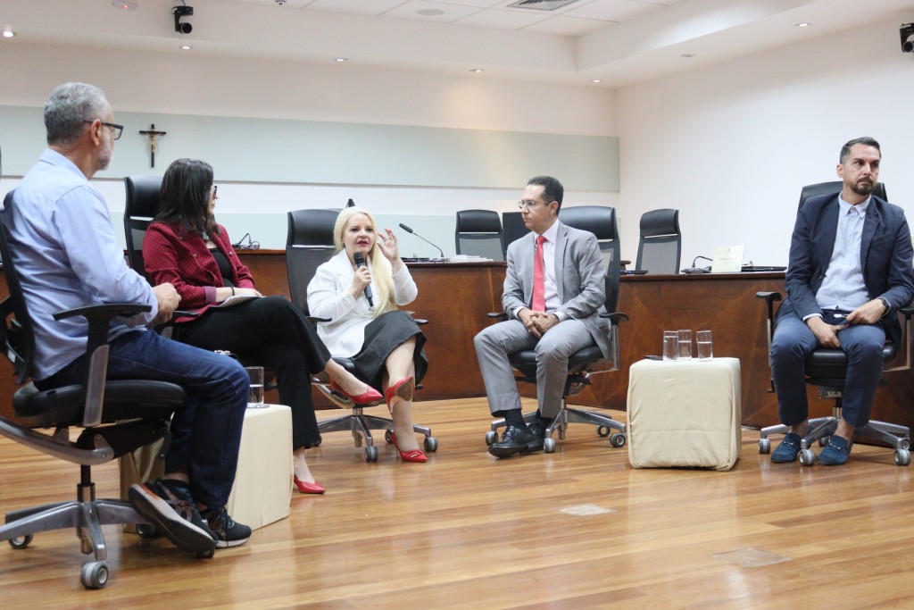 #PraTodosVerem: A imagem mostra uma roda de conversa composta por cinco pessoas sentadas em cadeiras giratórias em um ambiente formal, no Plenário do TRE-MT. Três homens e duas mulheres participam da discussão, sendo que uma das mulheres, ao centro, fala ao microfone enquanto os demais escutam atentamente. No fundo, há cadeiras de tribunal, microfones e um crucifixo na parede, reforçando o ambiente institucional. Copos de água estão dispostos sobre dois pequenos pufes no centro do grupo.