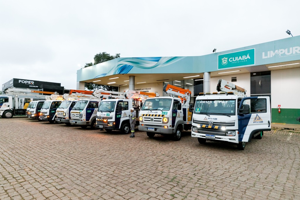 A imagem mostra os caminhões de reparos luminotécnicos estacionados em frente a Empresa Cuiabana de Zeladoria e Serviços Urbanos – Limpurb.