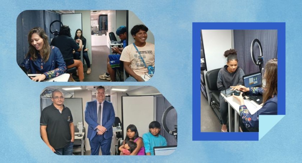 #PraTodosVerem: A imagem mostra diferentes momentos do atendimento a eleitores em uma unidade móvel da Justiça Eleitoral. Em destaque, servidores realizam o cadastramento biométrico de indígenas e outros cidadãos, coletando digitais e fotos. Um dos registros também mostra a presença juiz eleitoral local acompanhando a ação, indicando o caráter institucional da iniciativa. O ambiente interno é organizado e equipado com computadores e iluminação adequada para a coleta de dados.