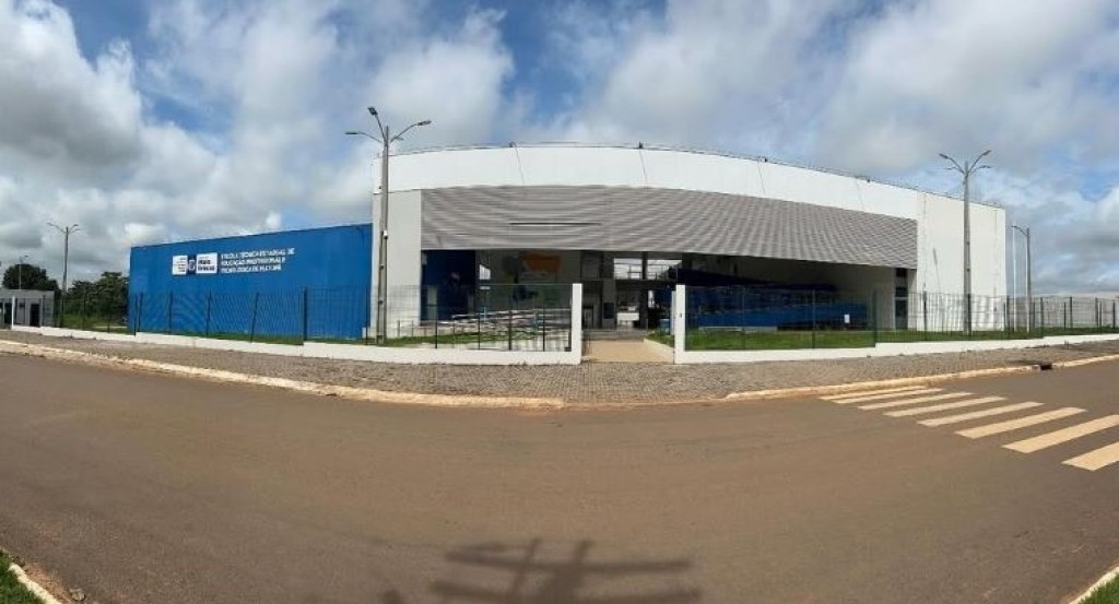 #PraTodosVerem: A foto da fachada da Escola Estadual Jardim das Flores foi tirada em modo “panorama”. A estrutura é grande, com paredes brancas e azuis. Há um letreiro que indica o nome do local e o símbolo do Governo de Mato Grosso. A escola é cercada por grades. Na frente, há uma calçada e asfalto. É possível ver uma faixa de pedestres.