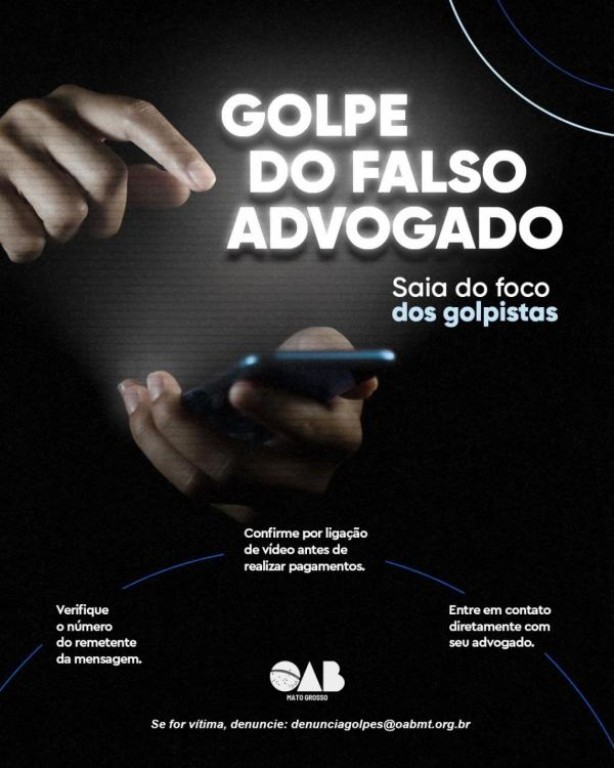 Para orientar clientes e advogados de todo o Estado, a OAB – MT está divulgando a campanha que tem como mote “Saia do Foco dos golpistas”. A OAB-MT criou canal para receber as denúncias. Todos que quiserem informar sobre golpes, tentativas de golpes ou fraudes podem enviar um e-mail para [email protected]. As denúncias recebidas pela OAB-MT serão encaminhadas para a Polícia Civil e demais órgãos responsáveis pela investigação ou outras providências que devam ser tomadas.