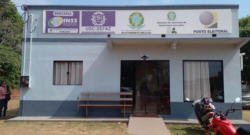 #PraTodosVerem: A imagem mostra a fachada do prédio onde funciona o Posto Eleitoral de Juruena, em Mato Grosso. O espaço também abriga serviços em parceria, como INSS, Sefaz, alistamento militar e emissão de carteira de identidade nacional. A entrada principal tem portas de vidro, uma pequena rampa de acesso e um banco de madeira na parte externa. Na frente do prédio, há motocicletas estacionadas e uma pessoa em pé ao lado esquerdo.