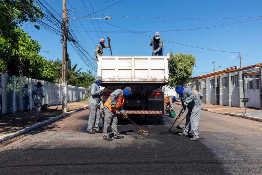 Imagem mostra equipes da Secretaria Municipal de Infraestrutura e Obras realizando a operação tapa-buraco no bairro CPA II.