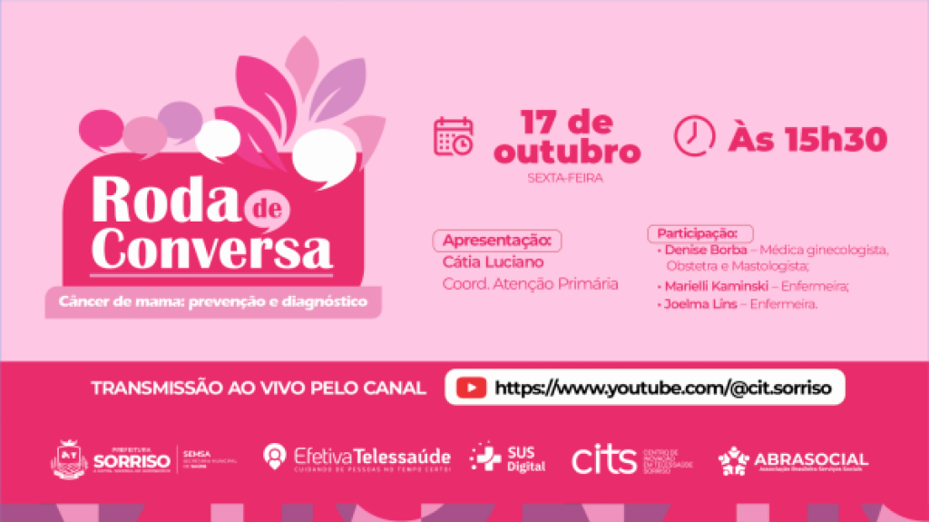 Em outubro, mês de conscientização sobre o câncer de mama, a Prefeitura de Sorriso, por meio da Secretaria Municipal de Saúde (Semos) e do Centro de Inovação em Telessaúde (CITS), convida toda a população para acompanhar um diálogo aberto e troca de informações sobre câncer de mama: prevenção e diagnóstico, que acontece nesta sexta-feira (17), às 15h30, com transmissão ao vivo no canal youtube.com/cit.sorriso.