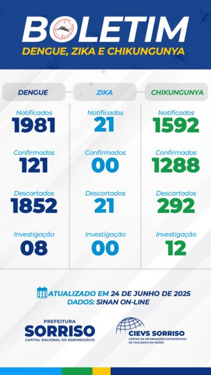 Hoje os bairros com maior número de registros de chikungunya estão o São José I com 87 casos; Nova Aliança I com 84 registros; Novos Campos com 65 situações positivas. Antigo distrito de Boa Esperança e atual município vizinho de Boa Esperança contabilizou 166 registros – vale lembrar que no Ministério da Saúde, Boa Esperança ainda consta veiculado à Sorriso. Já em relação à dengue são oito casos no Centro e sete no Rota do Sol.