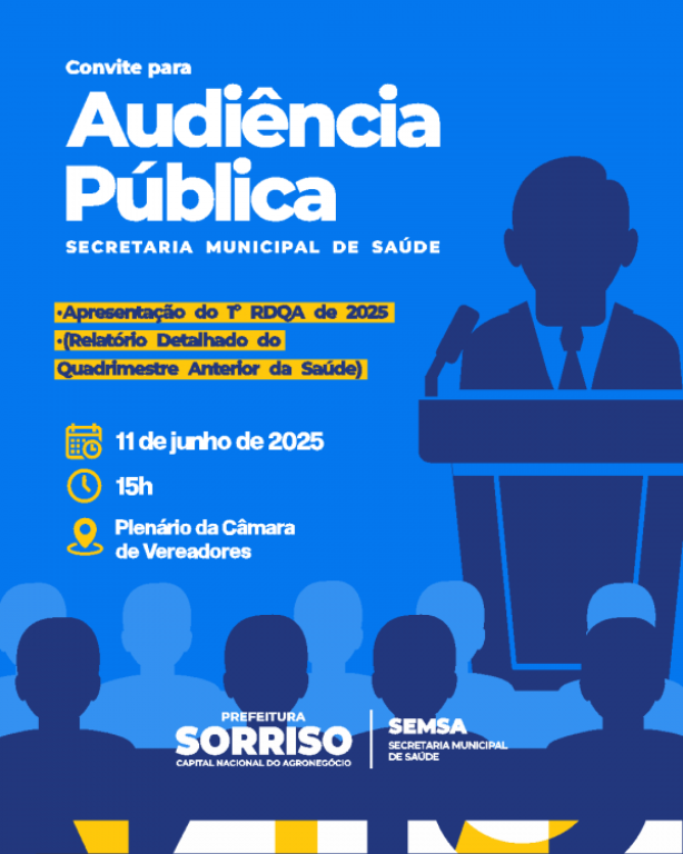 A Prefeitura Municipal por meio da Secretaria Municipal de Saúde, convida a população em geral a participar da Audiência Pública de apresentação do 1º Relatório Detalhado do Quadrimestre Anterior (RDQA) de 2025, que será realizada na próxima quarta-feira (11 de junho), no Plenário da Câmara de Vereadores.
