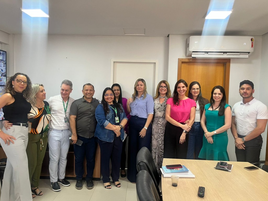 A imagem mostra um grupo de servidores acompanhados pela secretária de Saúde de Cuiabá em seu gabinete. A cena apresenta diversas cores e, ao fundo, as paredes são brancas.