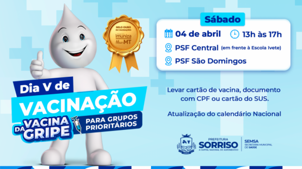 Se você é grupo prioritário e quer adiantar a dose, basta procurar qualquer uma das salas de vacina do Município a partir de amanhã, dia 02 de abril. Mas lembrando, nesse momento a vacina da gripe é direcionada aos grupos prioritários.