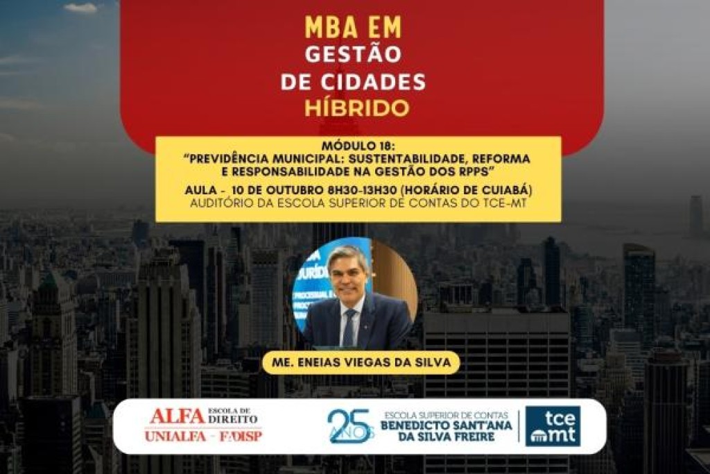 O Tribunal de Contas de Mato Grosso (TCE-MT) realiza o 18º módulo do MBA em Gestão de Cidades, a partir das 8h30 desta sexta-feira (10), no auditório da Escola Superior de Contas. A aula será transmitida ao vivo pelo Canal do TCE-MT no YouTube e pela TV Contas (Canal 30.2).