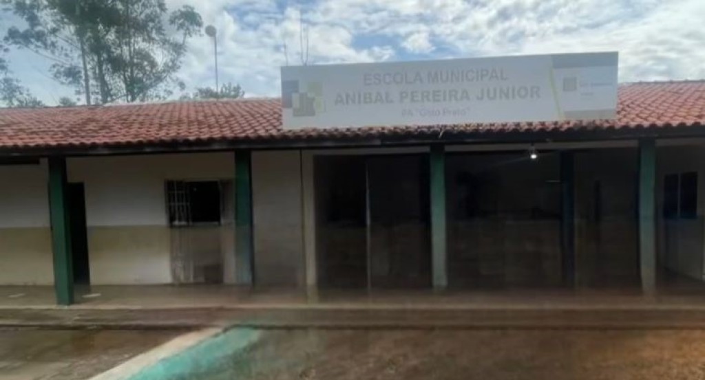 #PraTodosVerem: A primeira imagem mostra a fachada aberta da Escola Municipal “Aníbal Pereira Júnior”. Há uma placa branca grande acima do telhado alaranjado, indicando o nome do local. Os pilares são verdes e o pátio é de concreto. A segunda imagem mostra a Escola Estadual “Onecídio Manoel de Resende”, com paredes brancas e cadeiras escolares azuis.